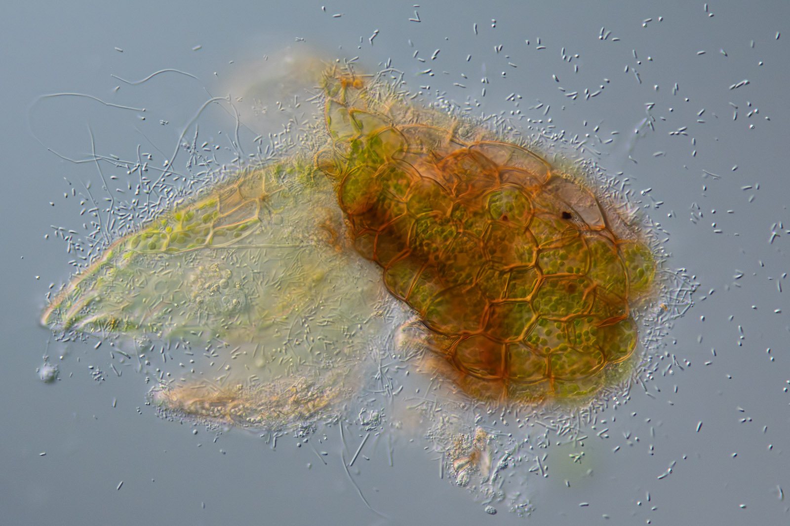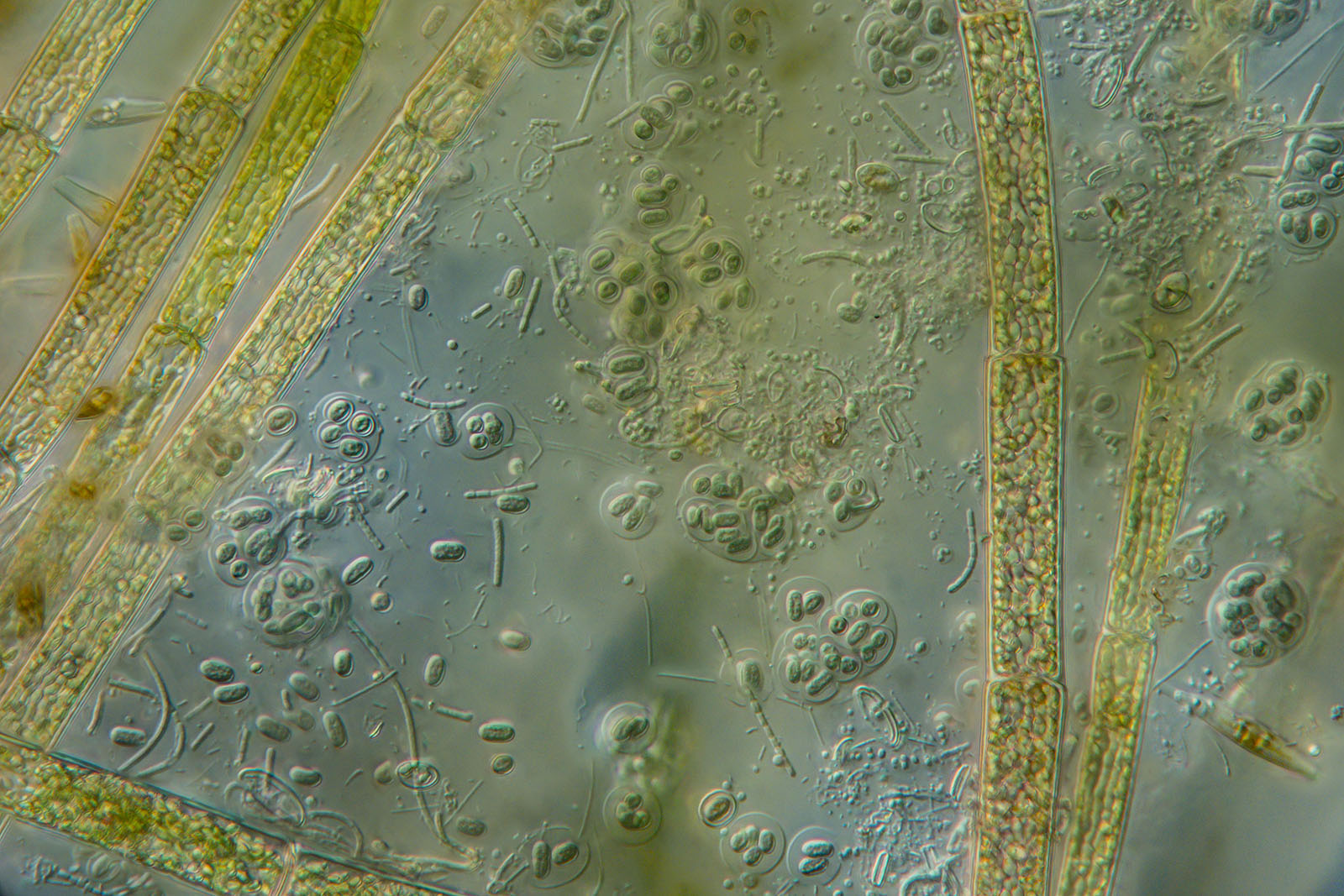 Unter dem Lichtmikroskop lassen sich Bakterien und Blaualgen durchaus anschauen, aber sie sind klein. Es entstehen abstrakter anmutende Bilder, die unsere Phantasie eintauchen lassen in eine schaurig schöne Ursuppe.